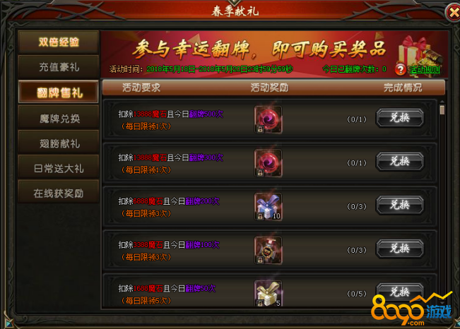 活动说明:活动期间,参与幸运翻牌活动,翻牌一定次数且消耗少量魔石可领取活动奖励