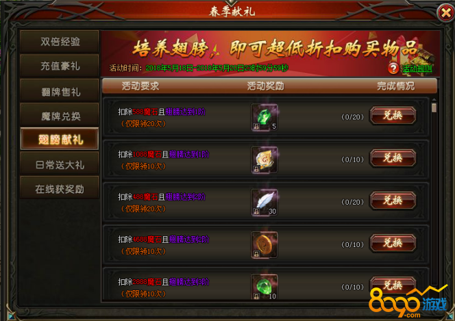 活动说明:活动期间,翅膀到指定阶数且消耗少量魔石可领取活动奖励,阶数越高,奖励越丰厚!