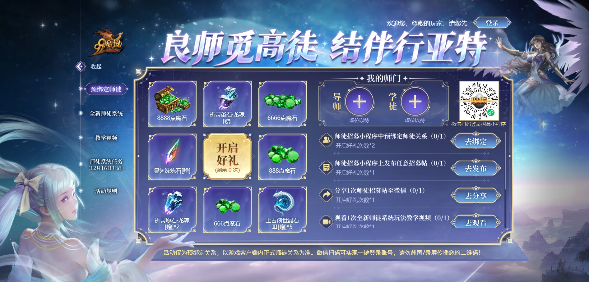 师徒预绑定活动现已开启!参与活动预绑定师徒关系,最高赢8888点魔石!“世界树:新生之章”重大活动更新后,若预绑定师徒双方在游戏内正式结成师徒关系,更可额外获得好礼,赢18888点魔石!