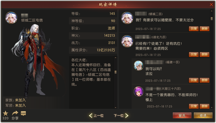 在师徒招募平台中,您可以查看他人招募帖,了解发布者的职业/神火/战斗力/属性评分等信息,寻找心仪的导师/学徒。师徒招募平台支持对同服玩家直接发起拜师/收徒申请,轻松缔结师徒关系。同时师徒招募平台也将同步上线小程序端,帮助您随时随地轻松查看师徒招募消息!