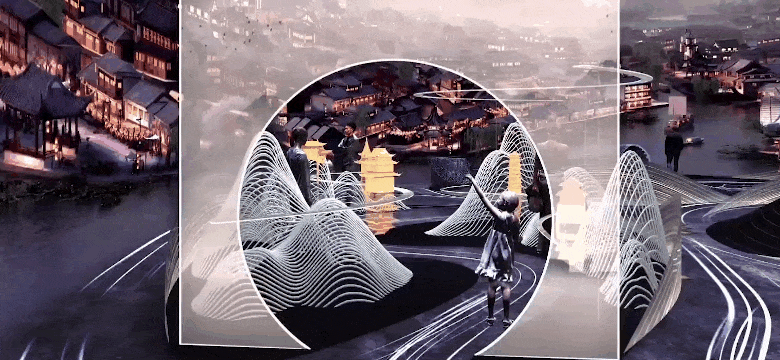 《寻梦牡丹亭》结合全息数字影像技术、巨型圆环装置投影等,创新设计沉浸交互表演场景,还原了《牡丹亭》中的亭、台、楼、阁等梦幻景致。