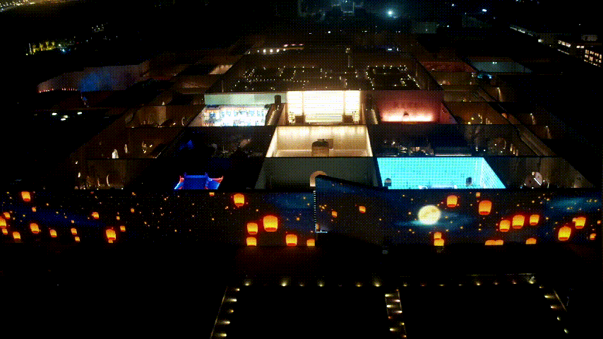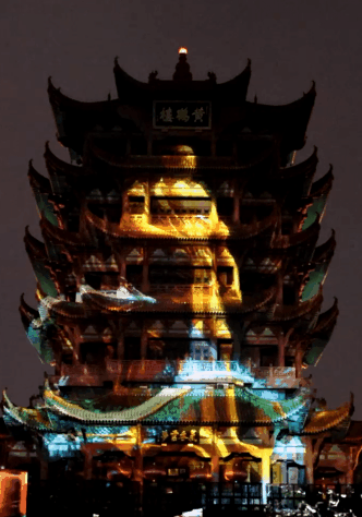 主楼前设有12块移动屏,通过激光投影、前景纱屏、演员影像互动等多项光影创新技术,上演辛氏沽酒、崔李题诗、岳飞点兵等沉浸式故事场景。让千年名楼黄鹤楼变得更加鲜活立体。
