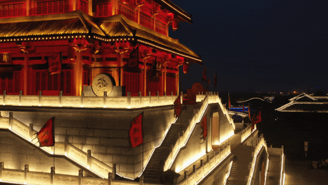 城墙在夜晚成为了光影表演的幕布,展出着全世界最长的动态作品,包括”北宋双绝“之称的《清明上河图》与《千里江山图》,绵延的巨幕让人身临其境般地感受文化的魅力。