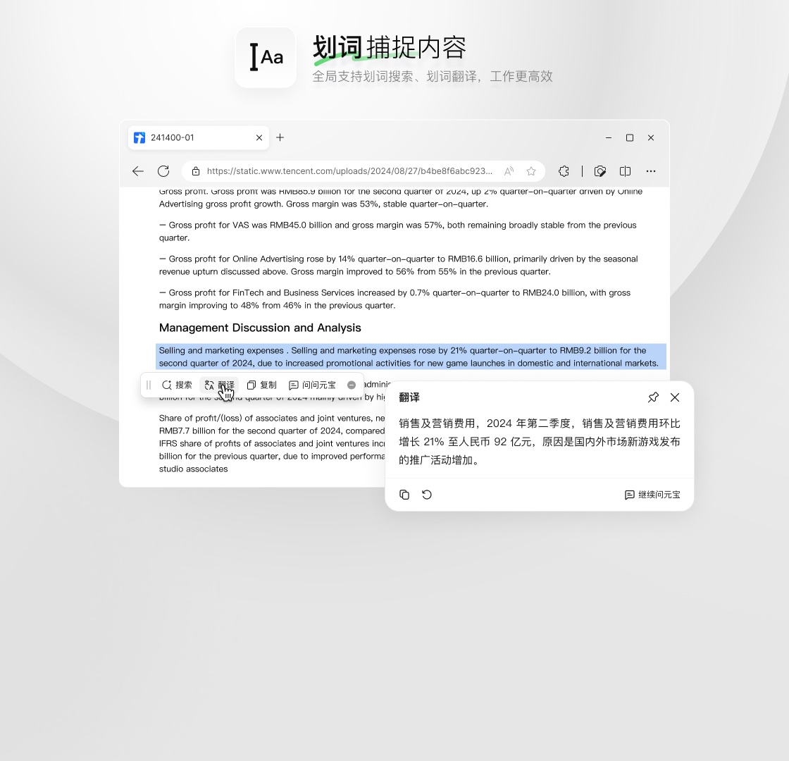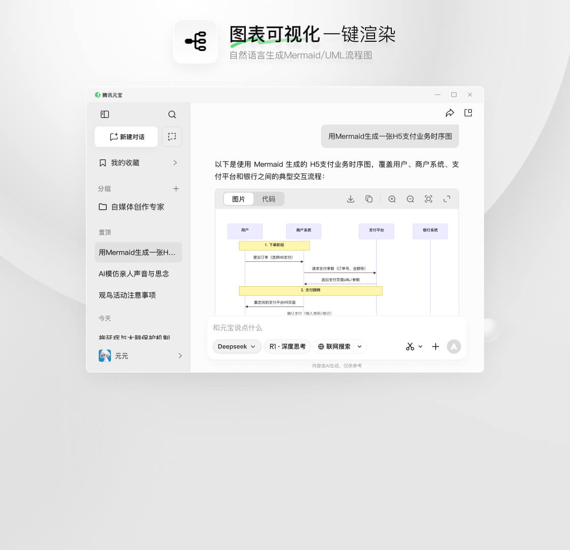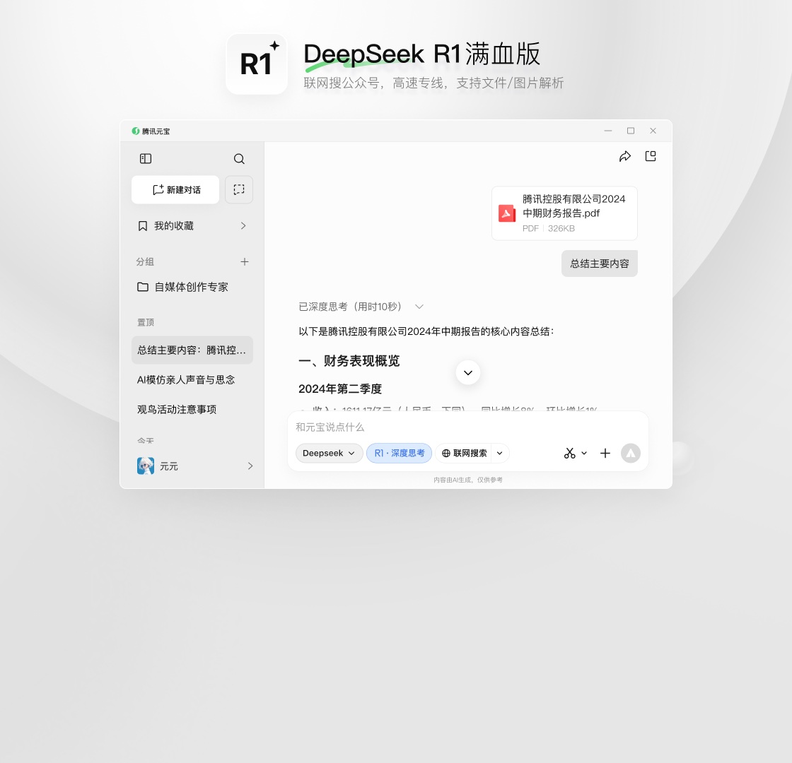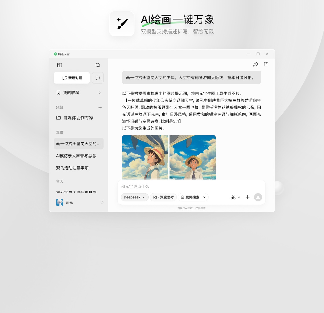 腾讯元宝电脑版「混元T1+DeepSeek R1联网满血版」,魔域打年在那双推理模型+联网搜索+高速专线。【划词捕捉】一键翻译与搜索,对话窗直显,操作更流畅。【迷你对话窗】快捷启动,随时提问。【收藏续创】收藏关键对话与内容,随时续写。【AI画图 秒出大片】双模型支持AI画图,智能扩写提示词,快速生成高质量图像。【分组定制指令,秒变专家】个性化指令库,匹配多种场景需求,解决复杂难题。【直连腾讯文档】支持导入与导出的存储。【截屏识图】支持截图和多图上传,图片提问更高效。【AI 全能助手】AI搜索阅读写作翻译。