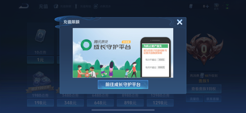 (图说:《王者荣耀》中,点击充值限额便会直接引导至成长守护平台)
