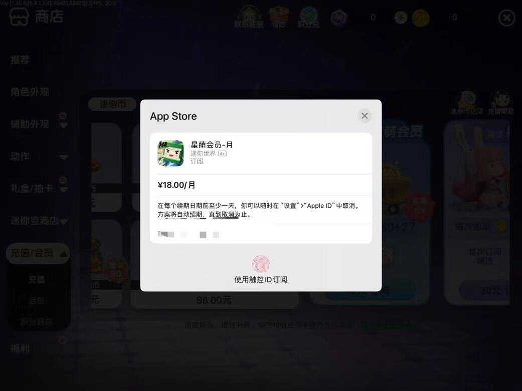 但令研究员意外的是,在测评《迷你世界》时,研究员以8岁以下用户身份登录后,成功付款并开通了价值18元的“星萌会员”。这一情况,显然违反了8岁以下未成年人禁充的规定。