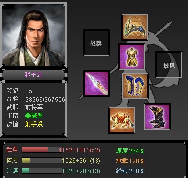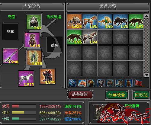 武将举足轻重的地位,注定了他必然会受到较高的礼遇。《决战天下》里,每个武将的装备是非常精致的。武将可以穿戴8件装备,包括武器、坐骑、头盔、胸甲、腿甲、战靴、披风和战旗。在“装备总览”中点击装备,就可以为武将穿戴装备。装备和武将也同样具有品级和级别。当武将的品级和级别分别都不低于装备的品级和级别时,才能穿戴该装备。在游戏中有橙色、紫色和蓝色套装各一套,比同品级的其他装备,具有更强大的属性。装备没有耐久度的说法,但是部分装备有持有时间限制,到时间就会消失。