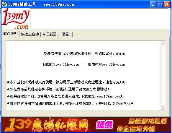 139魔域辅助(139MY魔域辅助工具)是一款非常棒的游戏辅助工具,久久魔域怀它可以应用于任何版本的魔域游戏,这款辅助最大的特点就是可以帮助玩家自动合宝宝当然了,还有很多强大的功能如:全自动版本,设置好副宠种类、外挂速度、特球种类、魔石种类之后,再清空包袱和幻兽栏,把鼠标放到合宝宝老头身上,按F8启动外挂,魔域合宝宝挂将自动挂机,让你省时省力更好的体验游戏。