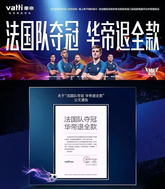 若法国国家足球队在2018年俄罗斯世界杯夺冠,凡是在2018年6月1日0时至2018年6月30日22时期间购买华帝“夺冠套餐”的消费者,一律按所购“夺冠套餐”产品发票金额退款。
