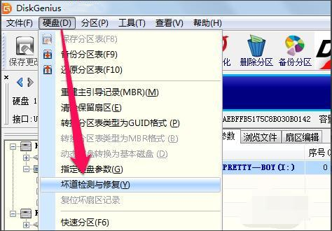 2、接下来在diskgenius中选择硬盘-坏道检测与修复。