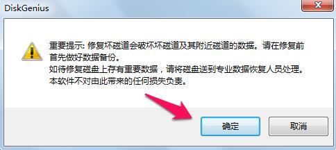 5、这时会看到diskgenius的提示我们提前备份好文件,以免diskgenius修复硬盘坏道时导致数据丢失,一般问题不大,点击确定就可以了。