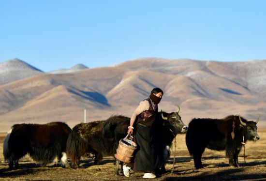 在青海省玉树藏族自治州称多县珍秦镇,牧民准备给牦牛挤奶。(资料照片) 新华社记者 张龙 摄