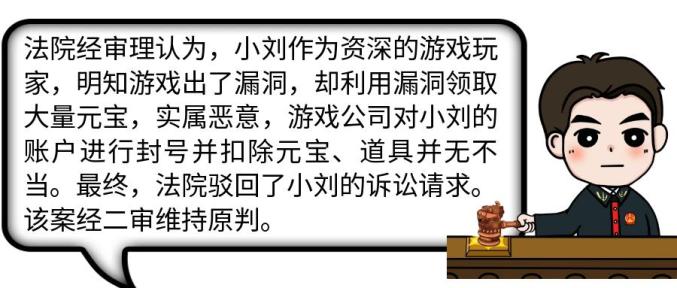 游戏公司告知小刘其账号出现了“无限领道具”的bug,暂时对小刘进行封号处理,在扣除账号中的元宝和道具后,便将账号解封。