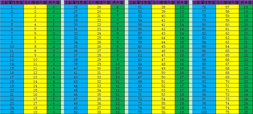 只发差值在100以下的,属性差100以上的,也只有初始生命才会出现,而且一般也很少人这么直接幻化,大多会选择用一个中间的过度以下,减少损失。举个例子,主幻兽初始生命20,副幻兽初始生命200,直接幻化的话,20 + ( 200 - 20 ) * 0.75 = 20 + 135 = 155,损失了45点,如果用个初始生命100的在中间过度下(就是先用初始生命100的幻化,然后用初始生命200的幻化),第一次幻化:20 + ( 100 - 20 ) * 0.75 = 20 + 60 = 80,第二次幻化:80 + ( 200 - 80 ) * 0.75 = 80 + 90 = 170,最终损失30点,比一次性幻化少损失了15点。