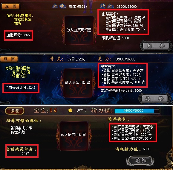 以上数据对绝大部分幻兽有效,对那些不能练副属性和初始属性的幻兽(例如战年法年、凤凰等)基本无效,血魂和骨灵也不符合上面的条件,看看上面截图里的骨灵和血魂的评分和副幻兽要求就知道了。