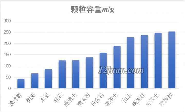 从图中可知,珍珠岩、树皮、木炭之类的比较轻质,轻石、鹿沼土、植金石、日向石等属于较轻的颗粒土,桐生砂、赤玉土、草炭粒比较重。