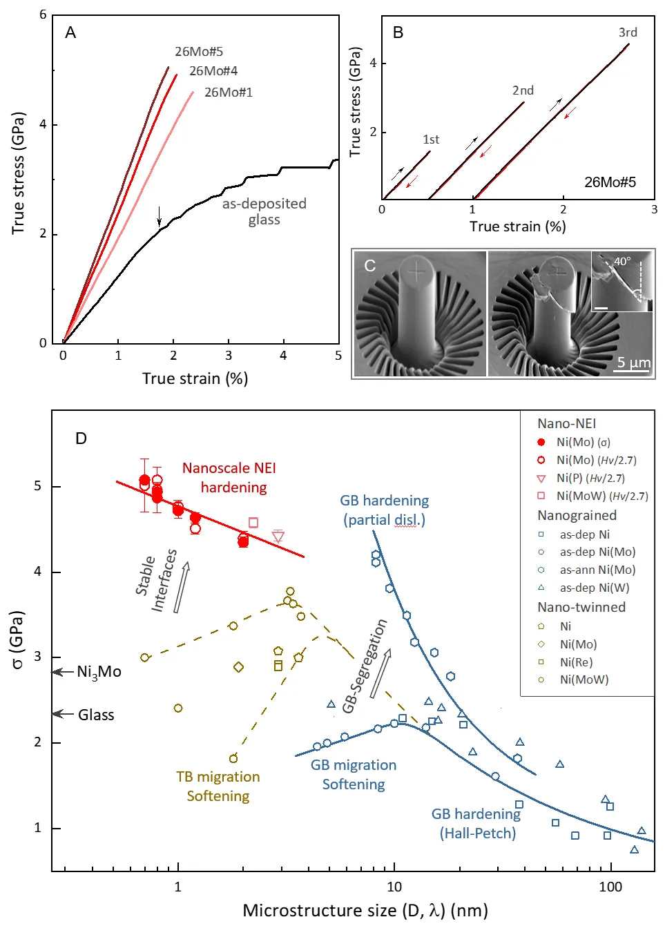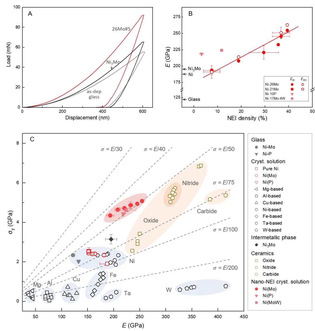 微柱压缩实验测量表明,亚纳米“负能界面”Ni(Mo)固溶体在加载过程中出现完全可逆的弹性变形,塑性变形被有效抑制,最高屈服强度高达5.08 GPa,远高于纳米晶及纳米孪晶镍基合金。这种强化机制与已知的纳米晶和纳米孪晶材料强化机制完全不同。Ni(Mo)固溶体的杨氏模量随界面密度升高显著增加,最高可达254.5 GPa,远超相同成分的非晶和金属间化合物,甚至高于部分氧化物陶瓷材料。杨氏模量的提升可能与亚纳米“负能界面”附近原子尺度应变以及电子局域化有紧密相联。亚纳米“负能界面”Ni(Mo)合金的强度/杨氏模量比为1/40~1/50,接近理论强度,强度接近部分陶瓷材料。在其他材料体系也发现了亚纳米“负能界面”强化效应。