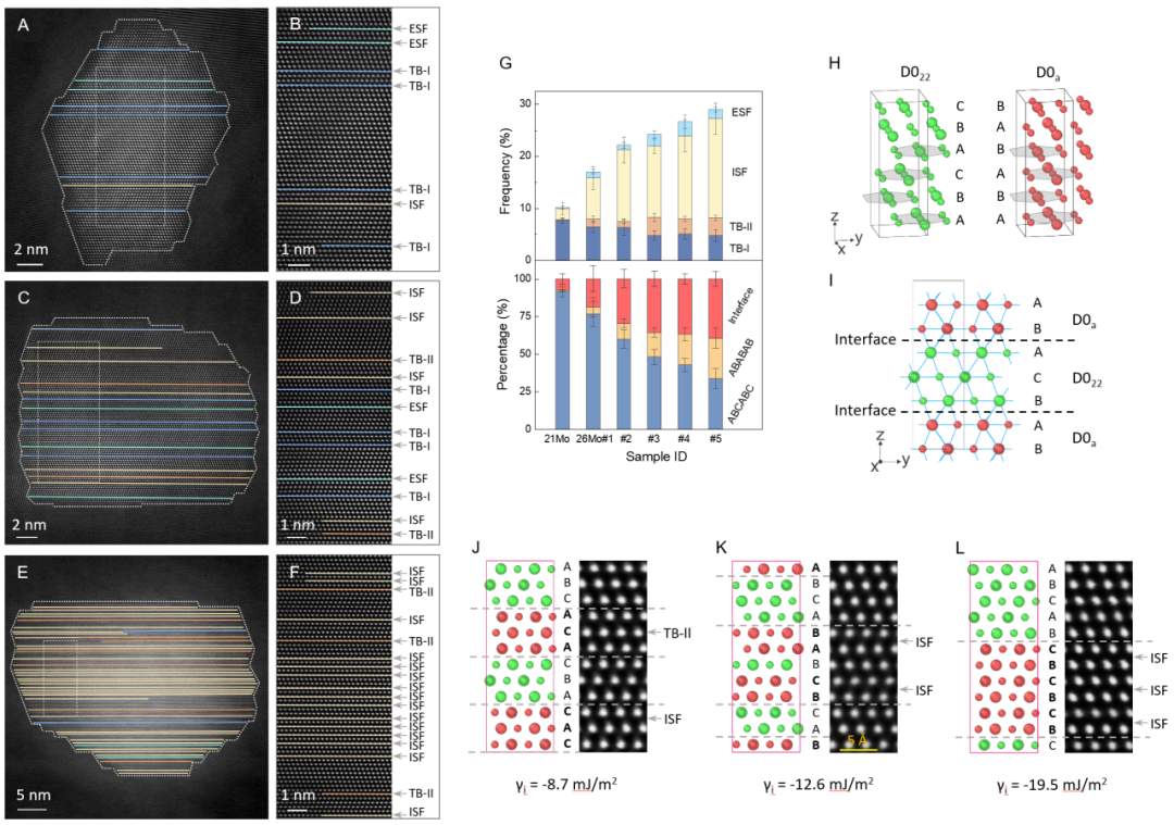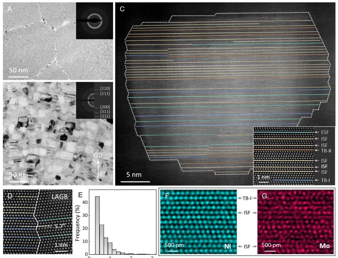 李秀艳研究员和卢柯研究员领导的研究团队利用电化学沉积制备出Ni-Mo非晶态合金,在非晶晶化过程中Ni原子形成面心立方晶格,Mo原子由于扩散速率低被随机捕获,形成Ni(Mo)过饱和固溶体, 大幅度降低了Ni晶格的层错能,导致形成极高密度孪晶和层错等面缺陷以释放弹性应变。Ni(Mo)过饱和固溶体中孪晶界和层错界占比高达29%,面缺陷间的平均层片厚度为0.7 nm,即3-4个原子层。晶粒间界面弛豫形成平直的低指数晶面。系统分析表明,晶粒内部形成面心立方(ABCABC堆垛)和密排六方(ABAB堆垛)混合的调制结构,ABCABC/ABAB共格界面的稳定性高于共格孪晶界,这与过去普遍认为的共格孪晶界是面心立方晶格中最稳定界面不同。通过密度泛函理论计算发现, ABCABC/ABAB界面过剩能呈负值,范围在-8.7至-19.5 mJ/m2之间,说明界面的原子键合强度高于相邻晶格相。