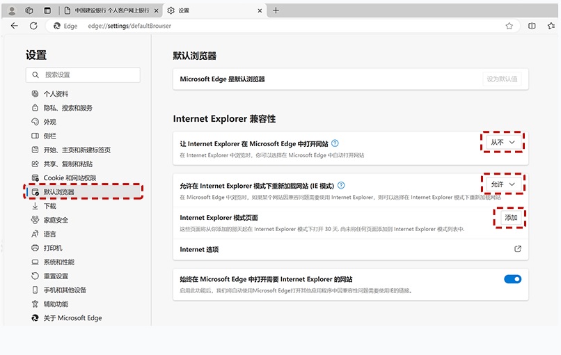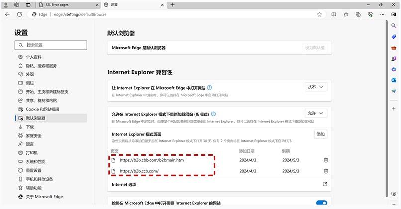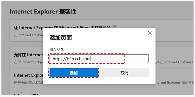 ③在弹窗地址栏中分别输入“https://b2b.ccb.com”和“https://b2b.ccb.com/b2bmain.html”网址,点击“添加”按钮,可将页面添加到Inte Explorer模式列表中开启浏览器,IE模式即可开启,如下图所示: