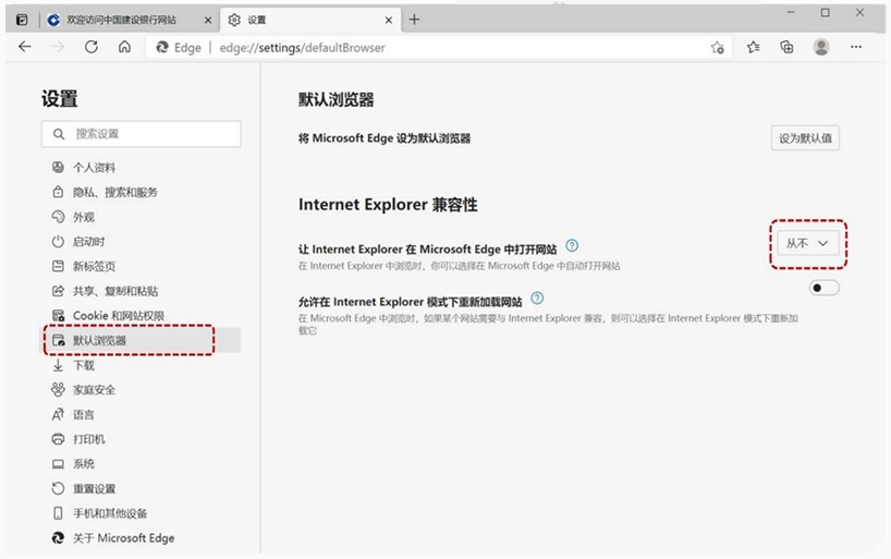 ②点击“设置”,在页面左侧的导航菜单中点击“默认浏览器”,将“让Internet Explorer在Microsoft Edge中打开网站”设置成“从不”或者“仅不兼容的网站(推荐)”如下图所示: