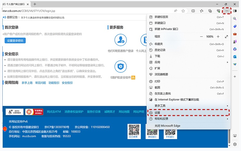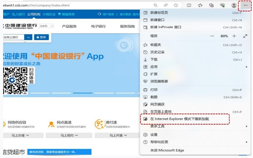 以上设置完成后,使用Edge打开企业网银页面,点击Edge浏览器右上角“...”图标-“更多工具”-“在Internet Explorer模式下重新加载”,点击该选项,页面会自动刷新,并切换至IE模式。