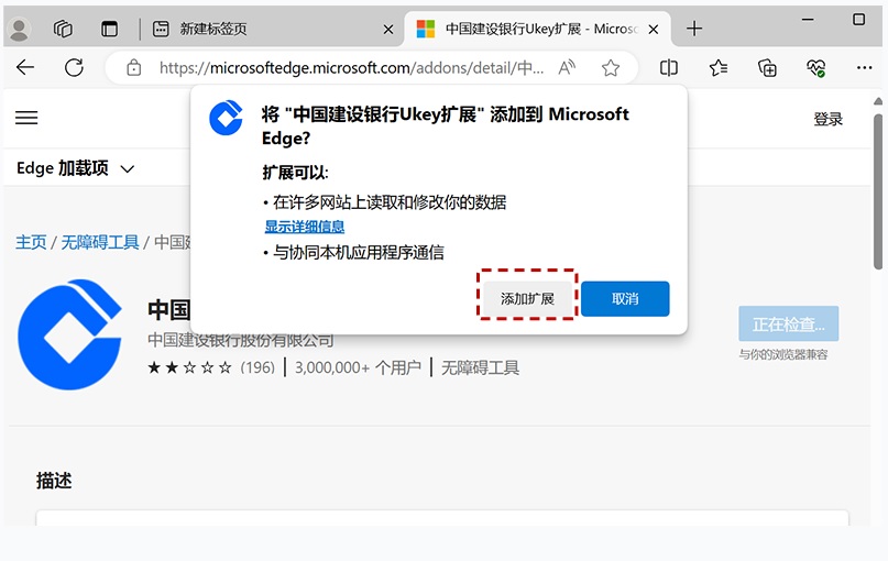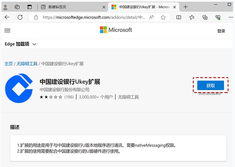 ①请点击“中国建设银行Ukey扩展”打开扩展安装界面,点击“获取”按钮后,选择“添加扩展”,将“中国建设银行Ukey扩展”添加到Edge浏览器,具体如下图所示: