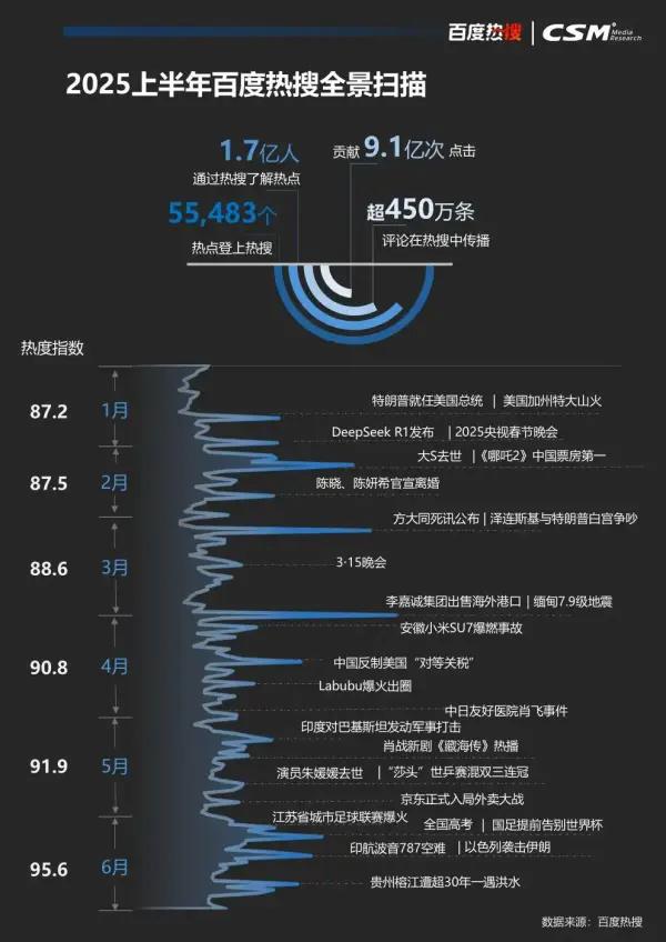 百度热搜上半年累计收获超9.1亿次点击量,成为公众注意力的核心枢纽。用户在热搜中解读时局、追踪名人、获取权威资讯,同时探索多元兴趣、感知文化潮流。