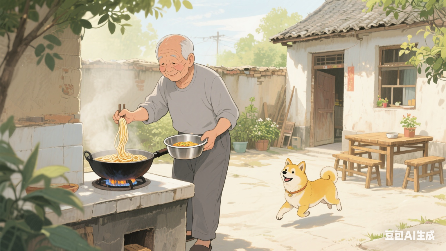 分镜二:黄色柴犬起身掉头跑到一边,背对老人,70 岁老爷爷仍在灶台旁继续盛面条,农村院子环境不变。