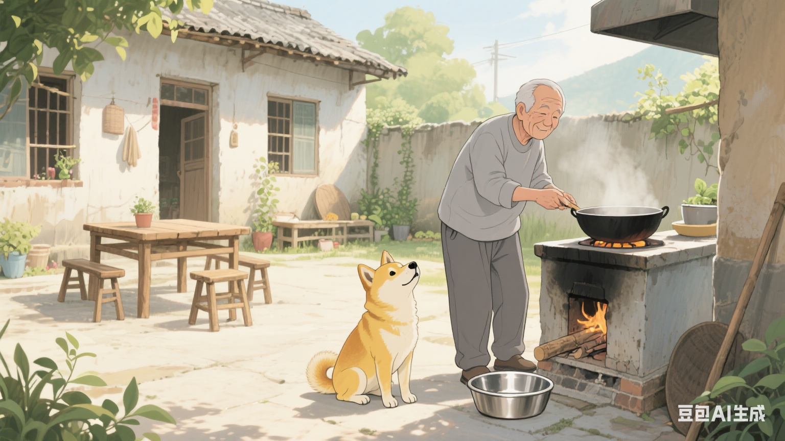 分镜一:农村院子里,灶台上的锅冒着热气,70 岁和蔼的老爷爷身穿灰色上衣和裤子,正从锅里盛面条到自己碗里,旁边卧着一只黄色柴犬,仰头看着老人。