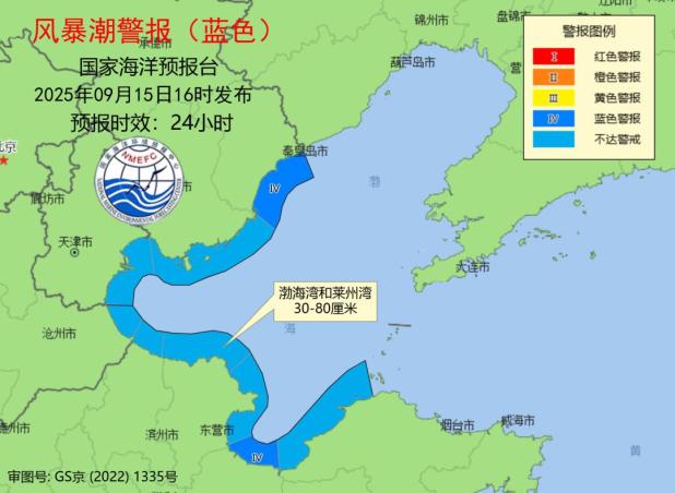 受冷空气的影响,预计9月16日中午至傍晚,渤海湾和莱州湾将出现30到80厘米的风暴增水。