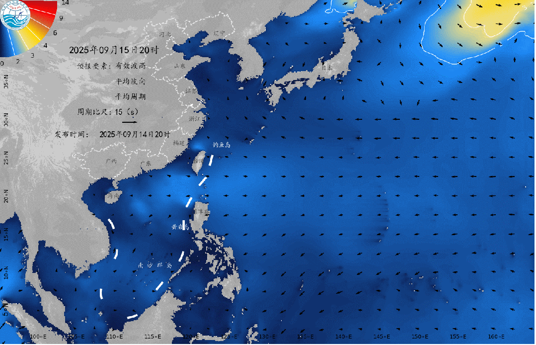 台湾海峡、台湾以东洋面、巴士海峡有0.9到1.8米的轻浪到中浪;