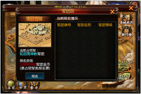 选择好打算争夺的城市,并花费军团金币进行报名后,报名军团的军团信息将出现在该城市的军团战当前报名情况栏下。