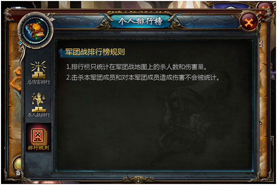 排行榜只统计在军团战地图上的杀人数和伤害量,击杀本军团成员或对本军团成员造成伤害,不会被统计进排行榜数据。