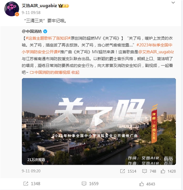 9月,国家消防救援局、教育部联合主办,江苏省消防救援总队、江苏省教育厅承办,南通市消防救援支队、南通市教育局协办的2023年秋季全国中小学消防安全公开课,由艾热演唱推广曲《关了吗》。