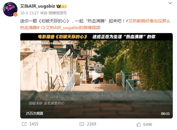 今年9月,艾热为破亿电影《好像也没那么热血沸腾》演唱插曲《划破天际的心》,表达出的对梦想的执着,对热爱的坚定,高度契合电影主题,无论在任何领域,面对挑战我们无所畏惧,披荆斩棘,终将赢得内心的胜利。