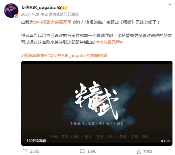 其实早在2020年,艾热就曾为赵文卓、释小龙等主演的电视剧《大侠霍元甲》创作演唱主题曲《精武》。