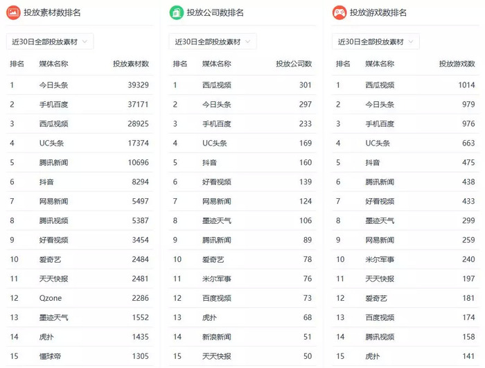 8月份的投放渠道中,最值得一提的就是西瓜视频跃居投放公司数和投放游戏数排名的TOP1,超过了“老大哥”今日头条,而在投放素材数的排名上,也拿下了TOP3的位置。在热门广告位的排名中,西瓜视频的信息流视频广告也排在了第二位。