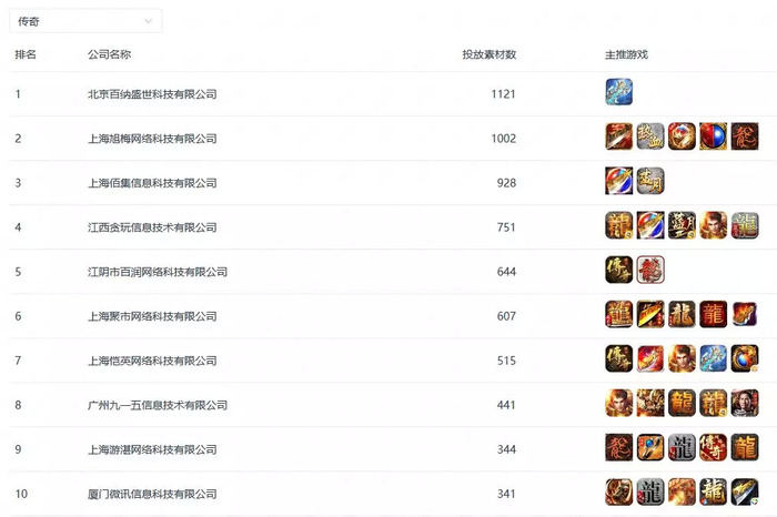 1.传奇类:百纳盛世科技拿下TOP1,《社会一刀》的投放力度最大