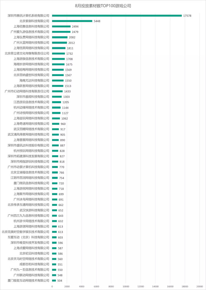 8月份单日最高参与买量的公司(当中包含壳公司)为 352家,与6月份相比增多了41家。以下是手游那点事根据投放素材数整理的8月游戏买量TOP50公司名单: