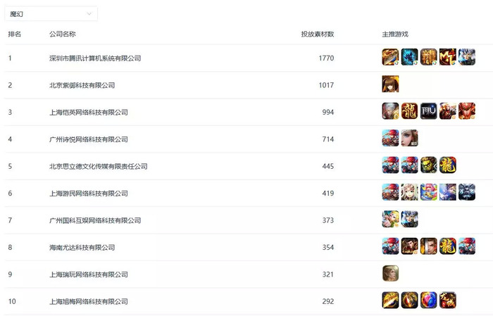 3.魔幻类:主推《风之大陆》的紫御科技排名TOP2,《龙城战歌》多个版本得到力推