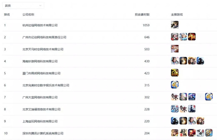 在武侠类产品方面,仍然是由边锋网络引领,主推游戏也还是一款《侠客风云传》,投放素材数为1059。TOP2至TOP5的游戏公司则分别是幻动网络(《武动风云》)、天马时空(《大掌门2》)、妙游网络(《逍遥剑客》)、舜邦网络(《万剑诀》)。
