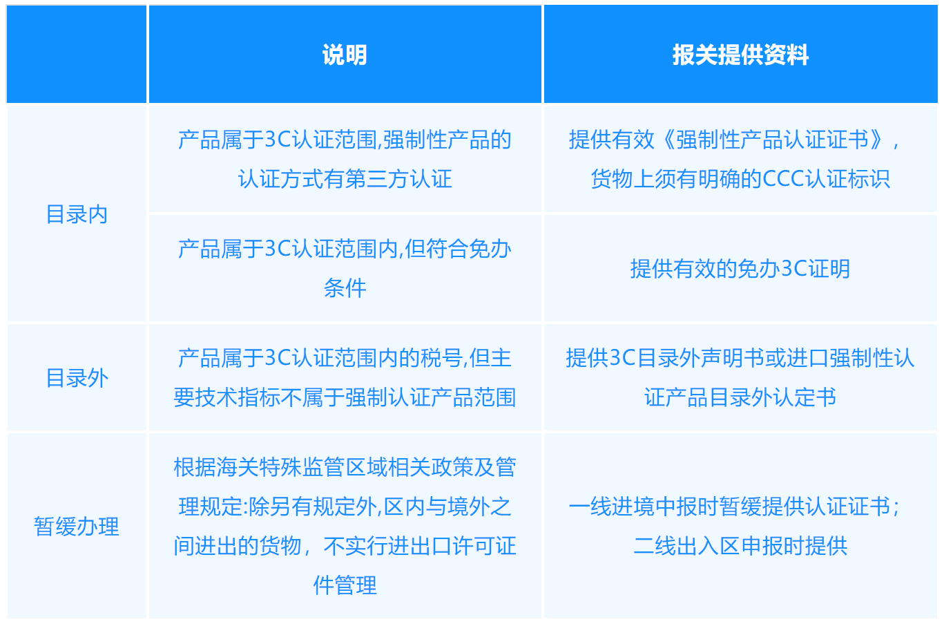 3C目录内依据申报时的具体情况不同分为三种情况:无需办理、免于办理和需办理。