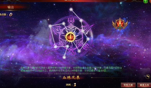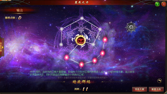 暗夜群蝠:星城点足够的话点满加伤害的,一般不加觉醒,(特殊情况:魔炎和PK和魔兽森林,可点上所有的星辰点并且觉醒捣乱~~)