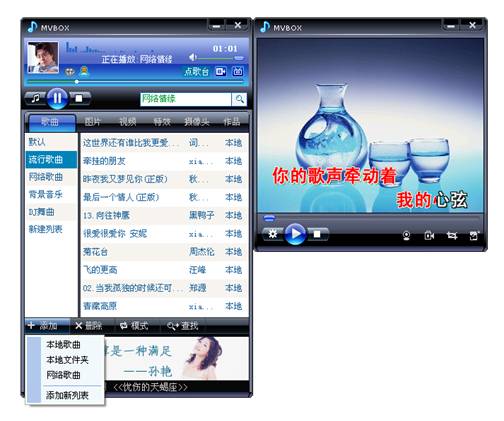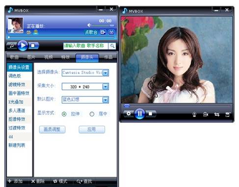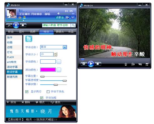 MVBOX利用大头贴前景技术给用户提供了多种分类特效:挂件、动画、边框、灯光、FLASH、AVI特效、滚动字幕、歌词字幕,用户既可以通过上方的“更多特效”切换到点歌台下载更多特效外,还可以自己新建和设置文件夹的名称对特效文件进行分类管理;系统还提供了滚动字幕和歌词字幕功能,下面分别说明一下。
