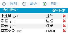 点击某个种类的特效会出现在下部“选中特效”中,MVBOX支持添加多个特效,同时可以随时删除或清空所选特效;系统提供特效三种显示模式:透明、融合、自动,用户可以选择不同的模式装饰视频画面。