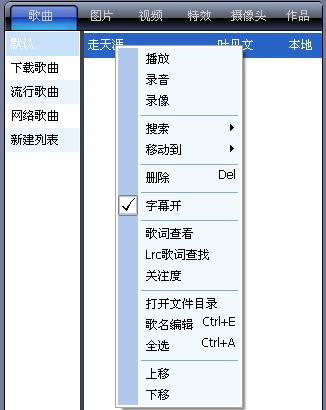 (4) 歌曲右键菜单可以选择上下移动歌曲位置、歌曲字幕开/关、和编辑歌名等等