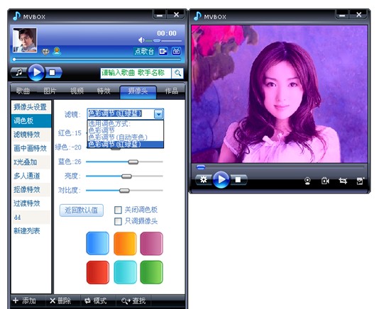 可以通过红绿蓝搭配技术来调节视频画面的色彩,调色模式有:色彩调节、自动变色、红绿蓝搭配调节(此种模式下系统提供颜色模板供用户选择)。