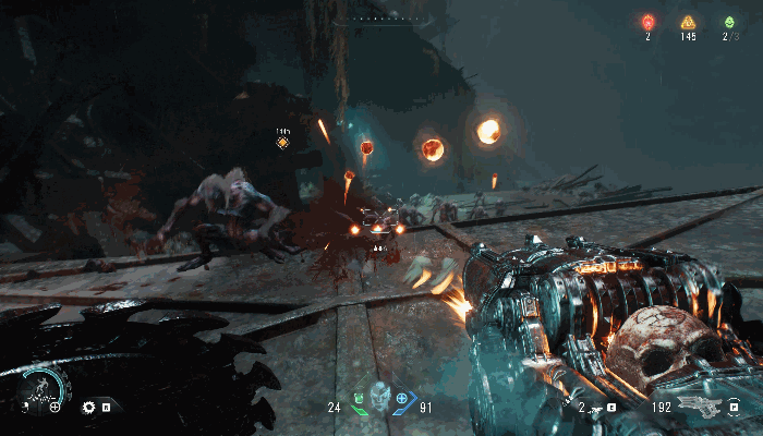 每把武器都有其特性和擅长的场景,在面对不同敌人时思考手头资源,构思各种打法的乐趣也蛮多的。举例来说,本作预告中惹眼的那把“颅骨枪”就有两种形态:散射和集中。散射适合处理大量杂兵平铺的情况,且杀怪越多即可越快充能,充能满后即可增伤还能加移速。而集中模式则会将原本散射的弹片集束在一起,大量弹片能迅速过热敌人的盔甲,也能对单一目标造成更多伤害。获取武器升级后,集中模式还可使敌人掉落生命补给道具,一边打一边回血。