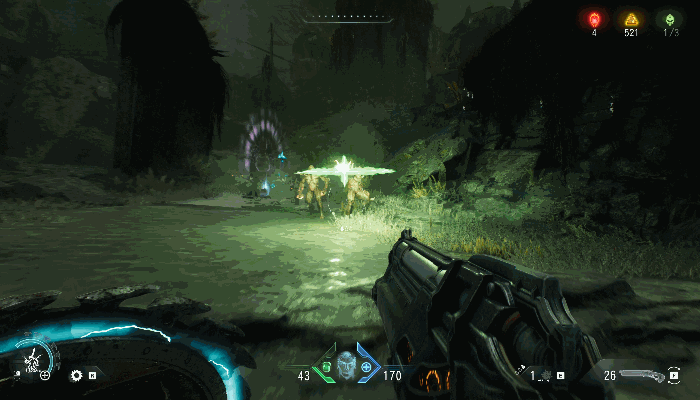 作为平衡,游戏也为盾牌添加了强大的弹反能力。许多中型与大型级别敌人都会使用带有绿色光芒的攻击,在绿色攻击命中前举盾格挡便会产生弹反效果,将子弹击回或令敌人进入硬直状态。好消息是,即便在噩梦难度下,弹反的判定仍然相当宽松(差不多有半秒钟),所以不必担心本作的近战部分会像魂系那样硬核。