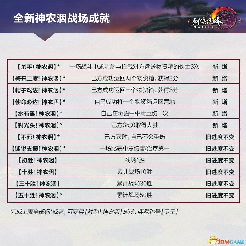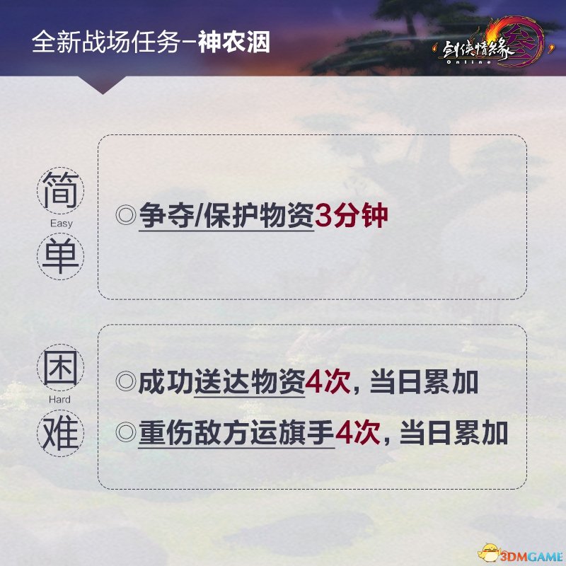神农洇一并引入全新的战场任务,在战斗开始后分派给各位侠士,完成后将有额外的数值奖励。其中基础任务为争夺或保护物资“旗手”3分钟。进阶任务可通过多次战场累计完成,分别为成功送达物资4次;成功协助击杀物资“旗手”4次。